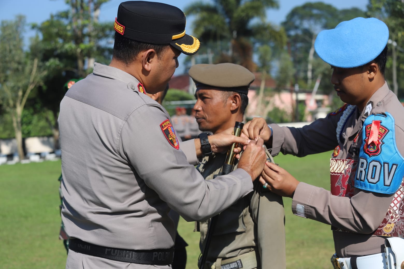 Apel diawali dengan pemasangan tanda pita oleh Kapolres Lampung Barat Rinaldo Aser kepada perwakilan TNI, POLRI dan Satpol PP.