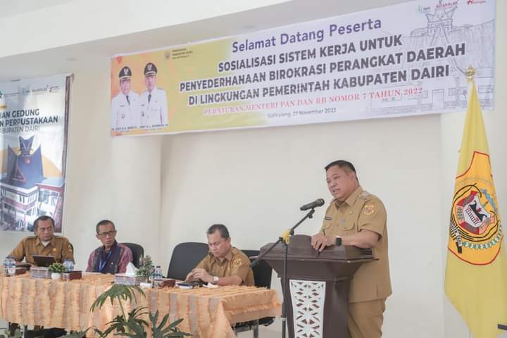 DAIRI,Tuntasonline.id - Bupati Dairi Eddy Berutu membuka Sosialisasi Sistem Kerja untuk Penyederhanaan Birokrasi Perangkat Daerah di Lingkungan Pemerintah Kabupaten (Pemkab) Dairi, Senin (27/11/2023), di Gedung Perpustakaan Daerah (Perpusda) Raja Naga Jambe, Sidikalang.