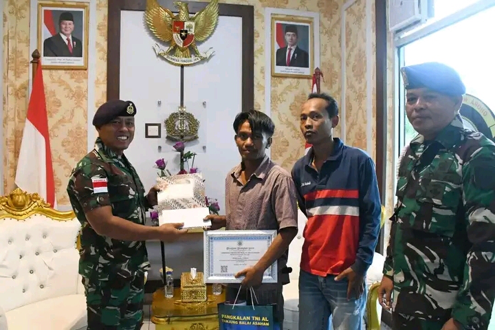 Asahan,Tuntasonline.id- Danlanal Tanjung Balai Asahan Letkol Laut (P) Wido Dwi Nugraha, SE.M.Tr.Opsla memberikan penghargaan kepada dua orang nelayan yang telah menemukan bom peninggalan Perang Dunia ke-II dan juga disertai pemberian hadiah uang tunai sebesar Rp. 1.000.000 per orang sebagai bentuk penghargaan dan  ucapan terima kasih atas dedikasi dan keberaniannya melaporkan temuan kepada Lanal TBA.
