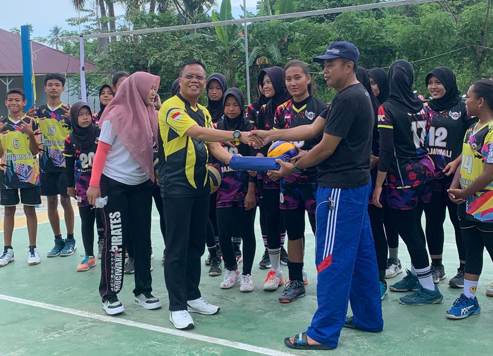 Secara simbolis perlengkapan olahraga bola volly diberikan Sumardi Kombes, dan diterima langsung oleh pelatih dan ibu-ibu setempat.