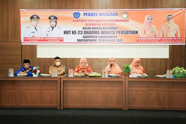 Labuhanbatu, TuntasOnline.Com - Dharmawanita Kabupaten Labuhanbatu adakan sosialisasi kampanye pentingnya pengembangan koperasi dalam rangka menyambut HUT ke- 23 di Aula Gedung PKK. Jl. WR. Supratman. Selasa (13/12/2022).
