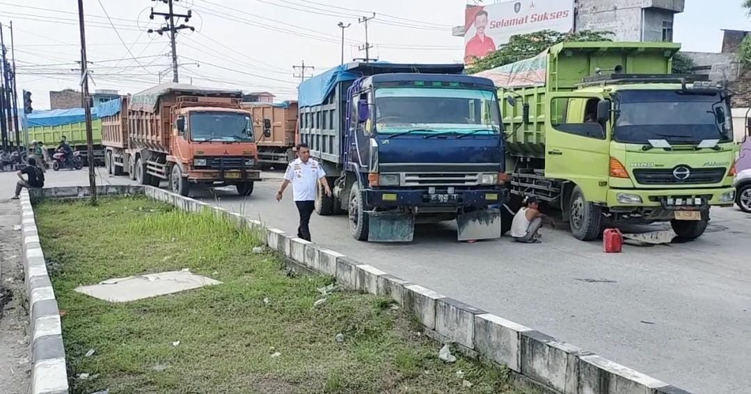 Sumatera Utara,TuntasOnline.id -  Puluhan truk pengangkut bahan material diduga di hadang dan dilarang melintas oleh tim gabungan Pihak Kecamatan Medan Tuntungan, Dinas Perhubungan dan Satpol PP Kota Medan di simpang pasar induk, Kelurahan Simpang Selayang, Kota Medan, Provinsi Sumatera Utara, Pada Jumat 18 Juli 2023 sekitar pukul 14.30 wib.