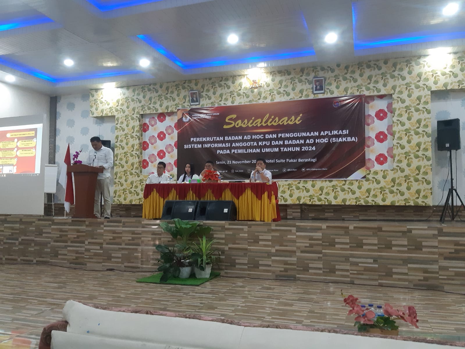 Karo,TuntasOnline.com - Dalam rangka pembentukan Panitia Pemilihan Kecamatan(PPK) untuk pemilihan umum Tahun 2024, KPU Kabupaten Karo menggelar sosialisasi tata cara Pendaftaran Badan Ad Hoc Pemilu 2024 untuk Panitia Pemilihan Kecamatan (PPK) maupun Panitia Pemungutan Suara (PPS)  yang berbeda dengan Pemilu sebelumnya Senen(21/11) bertempat di Hotel Suitpakkar,desa Raya Kecamatan Berastagi Kabupaten Karo, pukul 10.00.WIB.