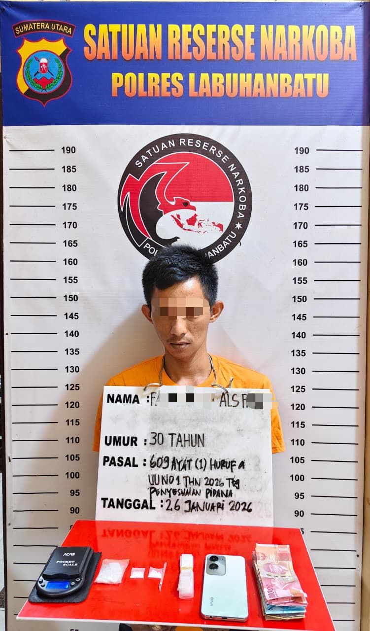 Dalam operasi tersebut, petugas mengamankan seorang laki-laki berinisial FA alias F (30), warga Desa Kuala Bangka, Kecamatan Kualuh Hilir. Tersangka diketahui berprofesi sebagai wiraswasta dan diduga terlibat dalam kepemilikan serta peredaran narkotika jenis sabu.