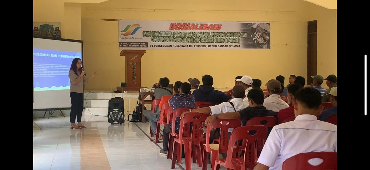 Sebagai Narasumber Norafita SH memaparkan materi tentang Pencegahan dan pemberantasan penyalahgunaan dan peredaran narkotika di kebun bandar selamat, akan bahaya Narkotika pada diri karyawan, sehingga karyawan PTPN III Khususnya Karyawan kebun Bandar Selamat paham akan bahaya Narkoba Dan bisa mengimplementasikan kepada Keluarga serta lingkungan sekitar.