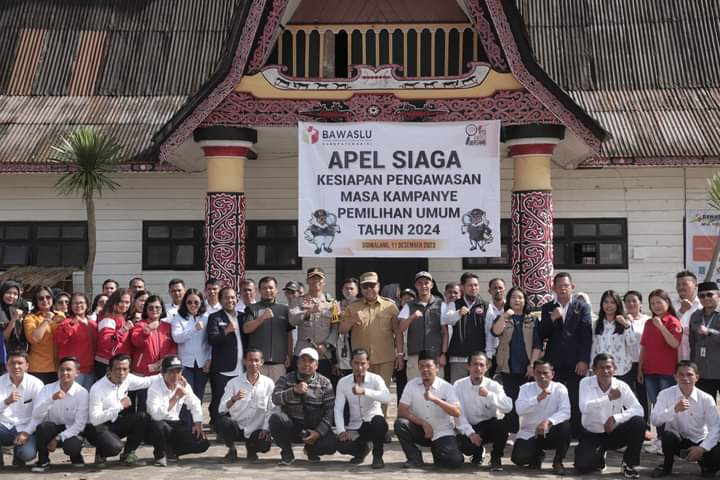 DAIRI,Tuntasonline.id - Menjelang Pemilu secara serentak 2024, Badan Pengawas Pemilu (Bawaslu) Kabupaten Dairi menggelar Apel Siaga dan Deklarasi Kampanye Damai, Senin (11/12/2023) yang turut dihadiri oleh Bupati Dairi, Dr. Eddy Keleng Ate Berutu.