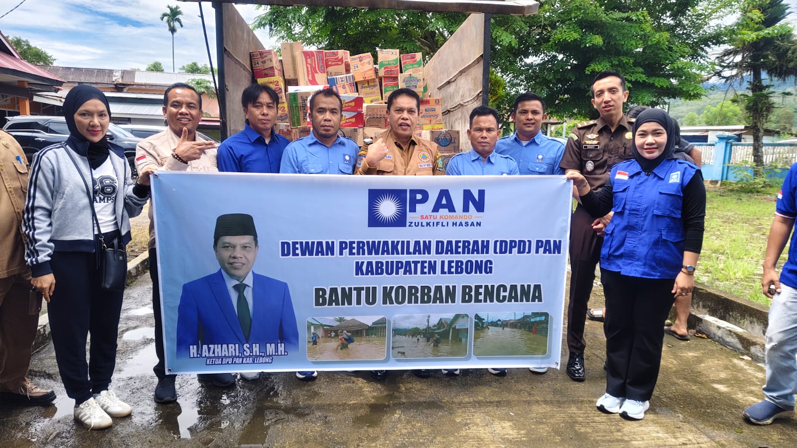 Terlihat bantuan yang diberikan DPD PAN ke Posko utama untuk dibagikan ke warga yang terdapak tersebut ratusan dus, terlihat dus bantuan yang debirakan seperti Air minum dan Mie Instan.