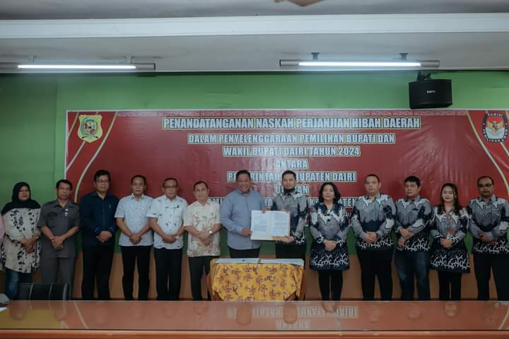 DAIRI, TuntasOnline.id - Pemkab Dairi bersama Komisi Pemilihan Umum (KPU) Dairi melakukan penandatanganan nota perjanjian hibah daerah (NPHD) dalam penyelenggaraan pemilihan Bupati dan Wakil Bupati Dairi tahun 2024, Sabtu, (11/11/2023), di ruang rapat Bupati di Sidikalang.