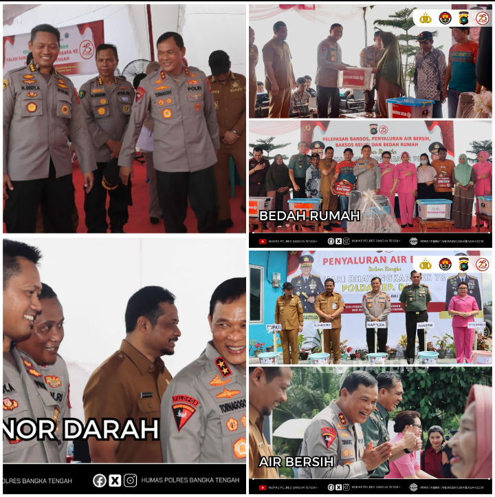 Polda Kepulauan Babel serta Polres Bangka Tengah melaksanakan serangkaian bulan bakti hari Bhayangkara ke 78 tahun 2024 yang mana kegiatan berupa distribusi air bersih, baksos religi, bansos, Donor darah, Bedah Rumah dan Bhayangkari Peduli, dilaksanakan bersamaan Polres jajaran se-Indonesia melalui Zoom meeting.