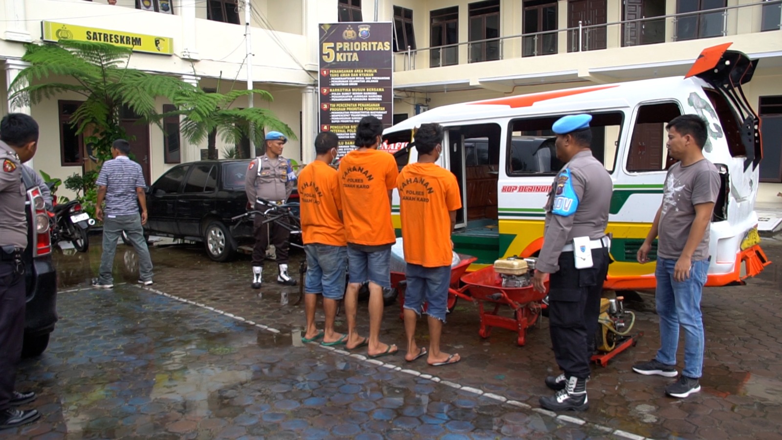 "Jadi ketiga pelaku ini secara bersama sama melakukan pencurian terhadap dua unit jetor, satu unit selang, dua unit mesin pompa, dua unit beko, dan satu unit cangkul dari dalam dan sekitar gubuk di perladangan Lau Jambu, Desa Lingga Julu, Kecamatan Simpang Empat", jelas Kapolres.