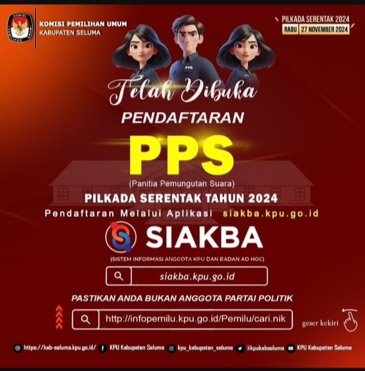 Kabar baik bagi masyarakat Kabupaten Seluma, jika kemarin KPU Seluma rekrut anggota PPK sekarang KPU kembali membuka perekrutan PPS, Untuk pilkada mendatang, Ada sebanyak 606 anggota Pps yang akan di rekrut berikut kemudian di seleksi oleh Kpu. Pendaftaran di buka pada tanggal 02/05/2024 sampai dengan 08/05/2024.