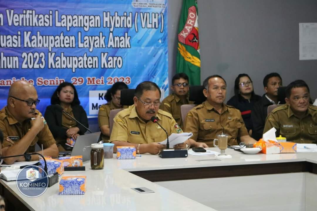 Karo,TuntasOnline,id - Sekretaris Daerah Kabupaten Karo, Drs. Kamperas Terkelin Purba M.Si buka acara Verifikasi Lapangan Hybrid (VLH) Evaluasi Kabupaten Layak Anak Tahun 2023 yang dilaksanakan melalui zoom meeting di Karo Command Center (KCC), Senin (29/05/2023).